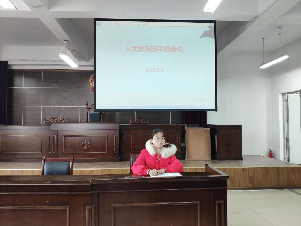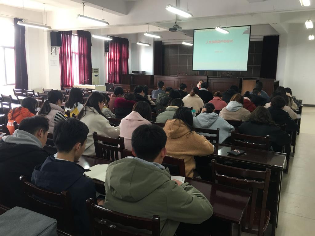 3月6日下午,人文学院在模拟法庭召开新学期第一次班团干部工作会议。辅导员曹珊珊、学生会团支部成员、各班级班长和团支书参加了会议。