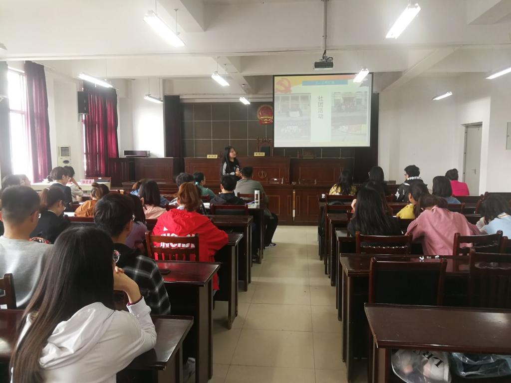 为扎实推进“两学一做”学习教育常态化,深入开展基层党支部建设, 4月8日上午,人文学院法学学生党支部在模拟法庭开展“2019年上半年拟发展对象答辩学习交流”主题党日活动,党支部书记李沙娜、法学专业田野老师以及法学学生党支部全体党员、入党积极分子以及9名拟发展对象参加活动。