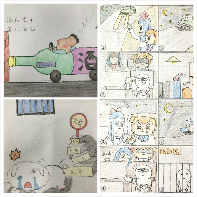 本次漫画创作比赛以征集各类宪法、教育法、义务教育法等为主题,作品中着重表现宪法修正案内容的系列漫画,并通过易班平台完成线上评选工作。经过前期的筹备,在同学们认真挖掘生活以及社会中的法律文化创意基础上,产生了一批形式新颖、创意独特和主题鲜明的漫画作品。最引人注目的莫过于杨崇镇选手的作品,用简约又不失美感的手笔绘画出了一个充满趣味而又不失哲理性的法律小故事,在具体的时间标示下,故事中的人物形象动作及内容表现都极为鲜明,尤其是司机的违法行为与警车的到来让漫画更具完整性,加之色彩对比突出,深刻的展现了司机与乘客的心理状态,这是极具法律文化创意的一幅作品。其他选手分别以酒驾、遵守宪法、维权和相关法律人物进行创作,都契合了比赛主题,用自己的创作诠释了法在我们生活中的价值内涵,让法的特色得到了体现。