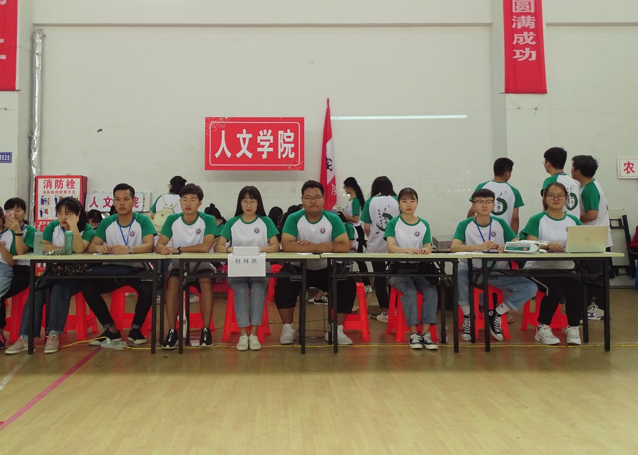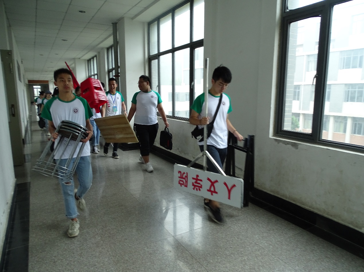 9月6日早,一群身穿白绿色T恤的学生早早起了床,他们举牌子,拿凳子、搬桌子,聚集在安徽科技学院西区的体育馆门前。他们是人文学院迎新的学生,从六点到八点,他们调试仪器、播放投影、准备材料,等待着新生们的到来。