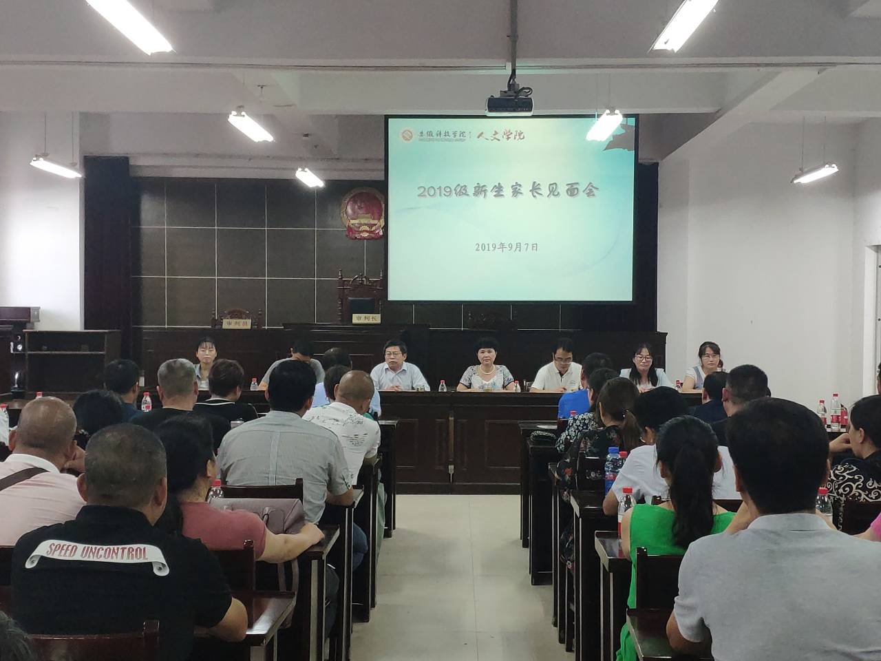 9月7日下午,人文学院于模拟法庭举办2019级新生家长见面会。人文学院党总支书记杜士凤,院长陈传万,副院长李晓东,汉语言文学教研室主任姚大怀,刑事法学教研室主任张晓云,党总支秘书、分团委书记李沙娜,辅导员曹珊珊和新生家长代表出席会议。见面会由杜士凤主持。