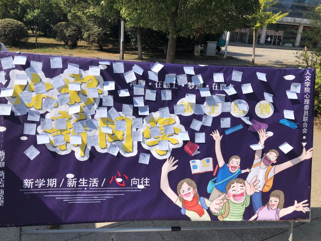 10月20日上午,学院心理委员联合会在西区小广场开展“展望未来”心灵寄语活动,工作人员在现场准备了小贴纸,让来往的新生写下自己对大学生活的展望。来往的新生们纷纷拿起纸笔,认真的写下对未来的期望,用一张张小小的便利贴构造出灿烂的明天。