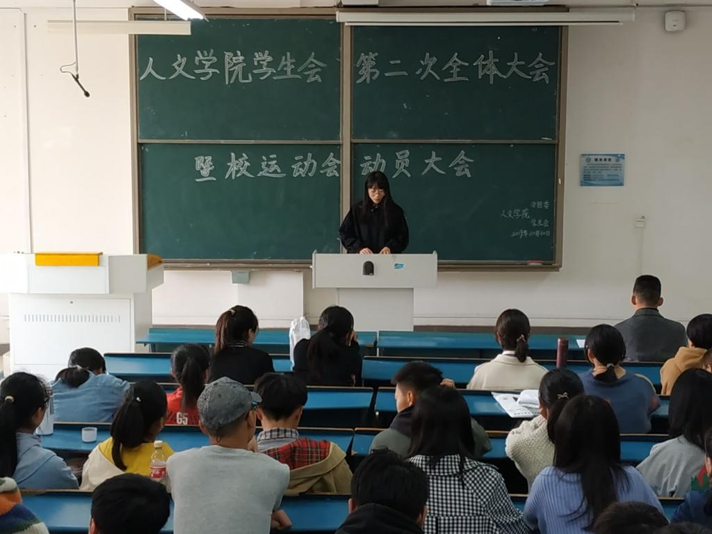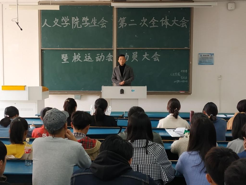 为迎接即将到来的第二十九届校运动会,提高我院师生对体育运动的热情,调动师生积极性。10月30日中午,人文学院于新知楼A208教室开展了学生会第二次全体大会暨校运动会动员大会。19级辅导员焦雪松出席会议,院学生会全体成员、校运会参赛运动员参加大会。会议由学生会体育部部长何敏主持。