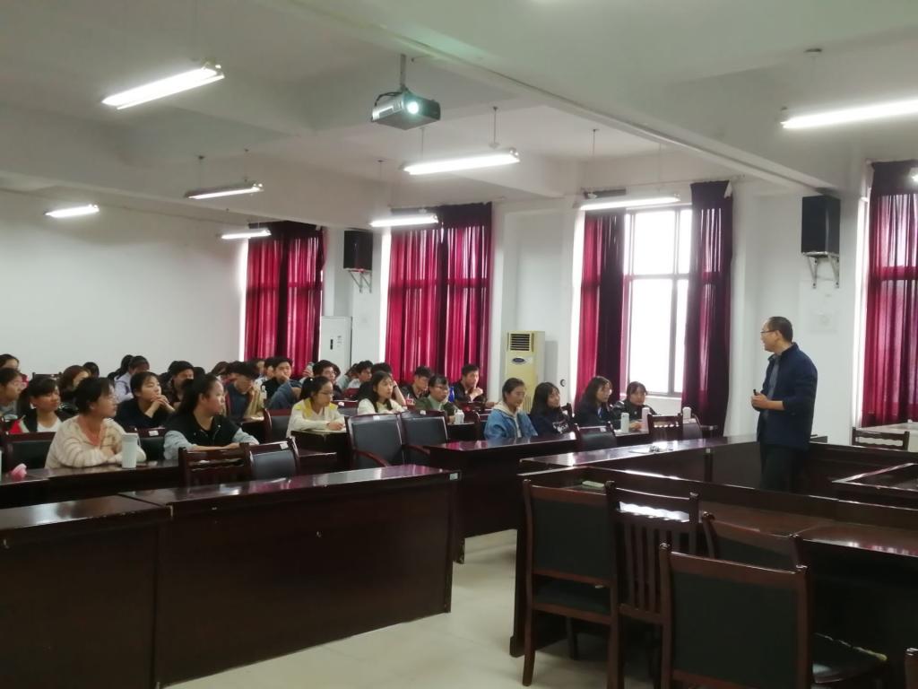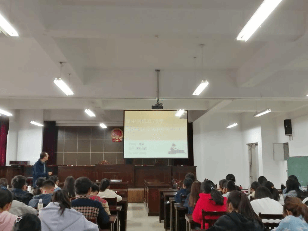 11月8日下午,在人文学院模拟法庭举行新中国成立七十年刑法立法经验与反思主题讲座。讲座由模拟法庭主任宣刚主持,19级法学全体新生到场参加。