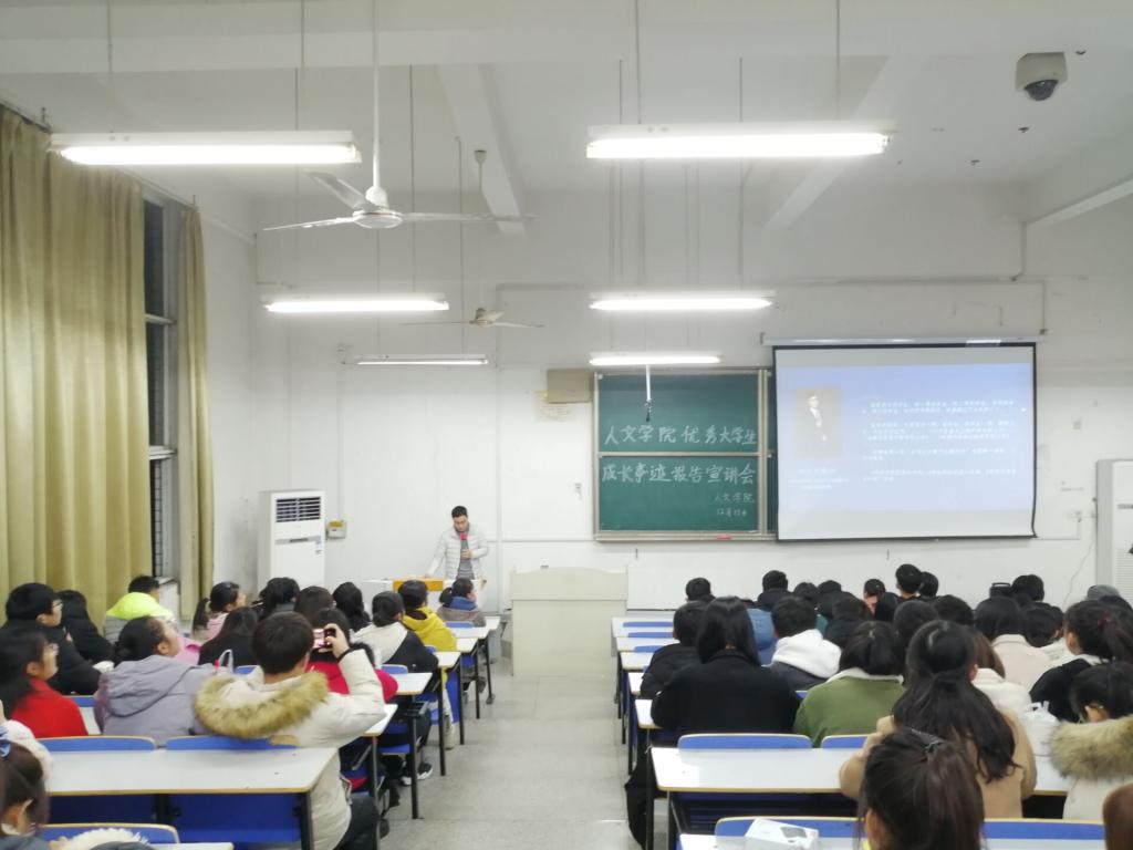12月13日晚,人文学院大学生成长事迹报告宣讲会在求知楼A106教室举行。机械工程学院工业设计172班尹牛牛和机械电子工程174班刘毛雪以及食品工程学院食品质量与安全171班王雪梅参加宣讲会并进行报告演讲。人文学院19级全体新生参加了会议,会议由人文学院学生会副主席高晓丹主持。