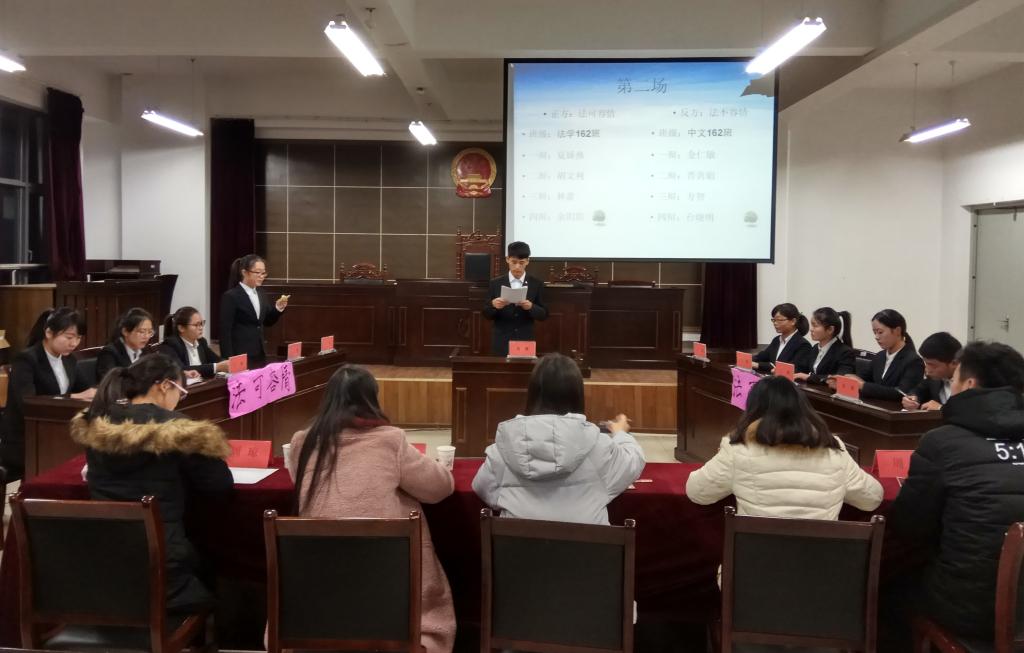 11月23日晚,人文学院首届法律文化节法律辩论赛决赛在模拟法庭成功举行。人文学院学生会主席田月月、校演讲与口才协会会长王美娜、校法新社社长陈维钰、校大学生辩论协会副会长周翔、第五届新生辩论赛冠军队代表周琼琼担任评委。