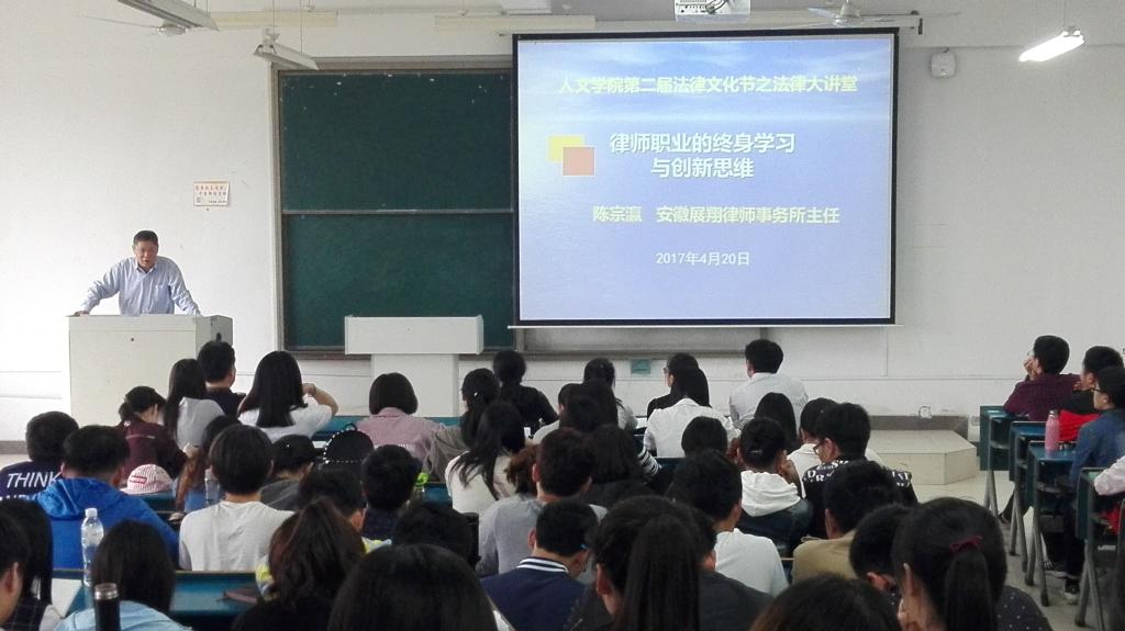 4月20日下午,应人文学院邀请,安徽展翔律师事务所主任陈宗瀛在新B301教室为2014、2015级法学专业学生作题为“律师职业的终身学习与创新思维”的主题报告。人文学院院长助理、刑事司法研究中心主任骆绪刚出席报告会。报告会由徐国庆主持。
