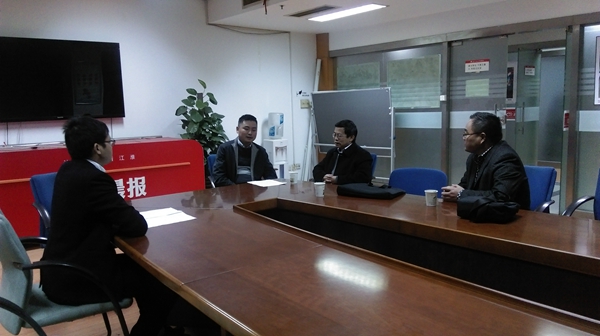 在合肥报业集团,人文学院一行与江淮晨报教育部主任王长春等,就实习实训基地建设交换了意见。双方就学生实习过程的安全问题进行了探讨,并达成共识。