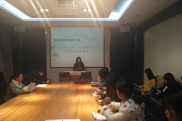 11月25日晚,正在禾泉小镇进行写作实践教学的2016级中文专业,按预定计划开展诗歌散文朗诵会。朗诵会分三组进行,指导老师苏兆龙、姚大怀、陆山花分别担任主持,2016级中文专业全体学生参加。