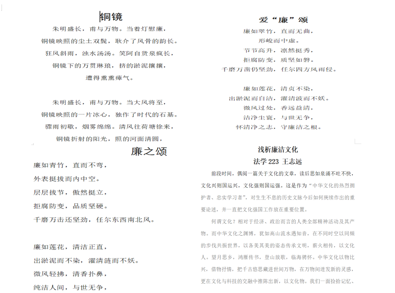 “文字学廉,话廉润心”。师生们结合专业特色,积极参与廉洁主题征文比赛,或讲述古今中外廉洁奉公的感人故事,或剖析身边的廉洁事例,或抒发对廉洁价值的深刻感悟。一行小诗,一篇散文,都像是一颗廉洁的种子,承载着大家对廉洁文化的理解与追求。廉洁主题征文活动的开展,有利于广大师生进一步坚定理想信念、强化廉洁意识、筑牢思想防线。