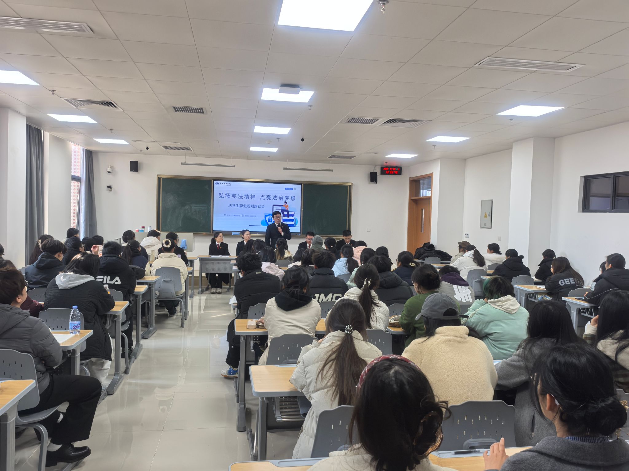 12月5日下午,人文学院邀请滁州市中级人民法院法官来校,举办以“弘扬宪法精神,点亮法治梦想”为主题的职业生涯规划座谈会。座谈会由辅导员鲁冰冰主持,法学专业2025级同学参加。