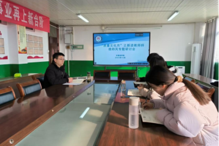 为贯彻落实学校“质量文化月”要求,进一步加强师德师风建设,切实提高教师思想道德水平,12月28日下午,外国语学院在学院会议室召开新进教师师德师风专题研讨会。会议由学院党委副书记、纪委书记张海亮主持,2023年新进教师衡鹏、强小云、孙玉梅参加研讨。