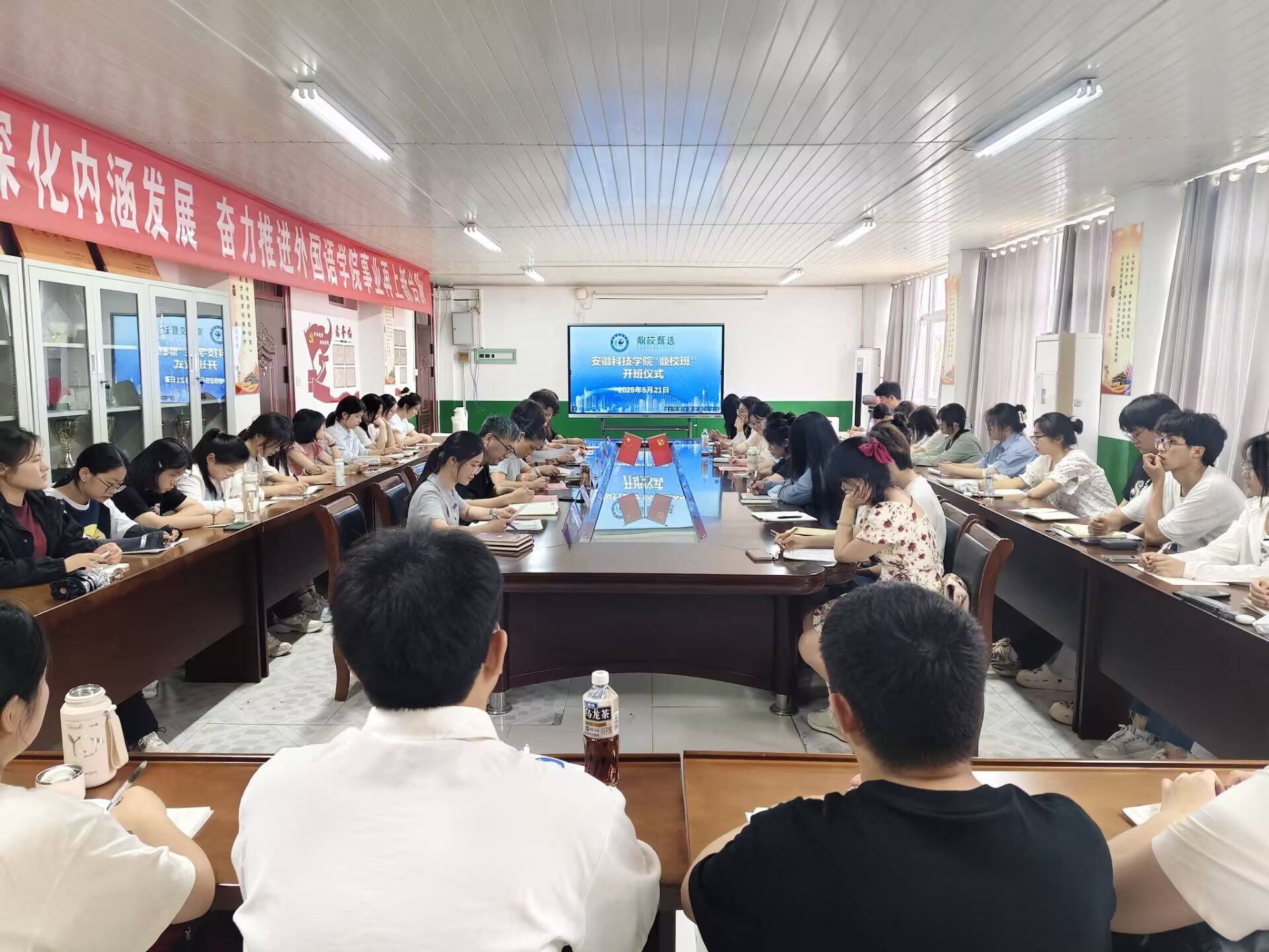 5月21日下午,安徽科技学院“鼎校班”开班仪式在学院会议室举行。外国语学院党政领导、安徽鼎校教育科技有限公司(以下简称“鼎校教育”)相关负责人以及“鼎校班”40名学员参与活动。开班仪式由学院党委副书记张海亮主持。