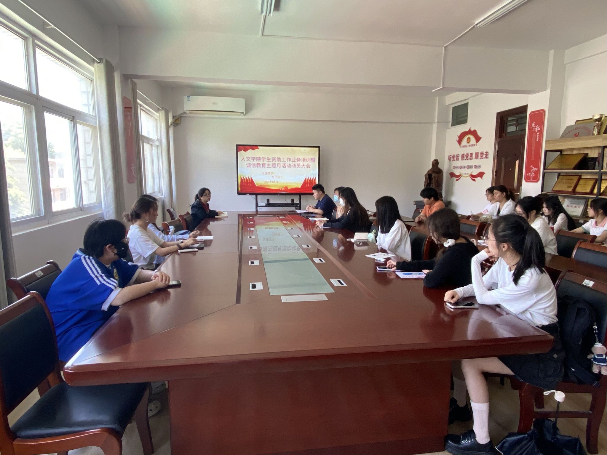 为更加有效推进资助诚信教育主题月各项活动的组织与实施,5月15日,人文学院资委会指导老师鲁冰冰在学知楼324教室主持召开学生资助工作业务培训暨资助诚信教育主题月动员会,学院全体资助委员参加。