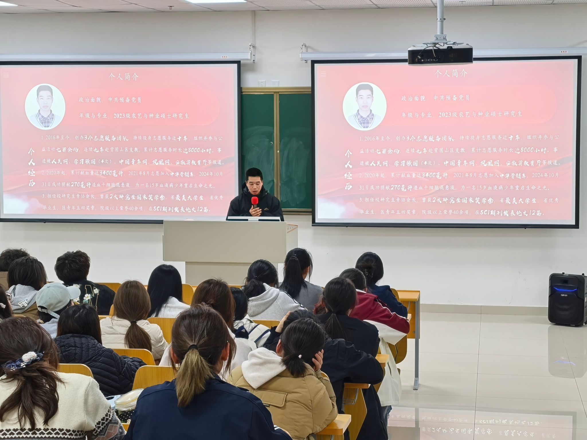 王同汉是我校2023级农艺与种业研究生,荣获安徽省2025年“最美大学生”称号。报告会上,王同汉分享了自己捐献骨髓干细胞救助他人,十年如一日地开展志愿服务,深耕学术、高效产出,以及积极服务乡村振兴的实践故事,诠释了新时代青年党员的崇高使命与先锋本色。