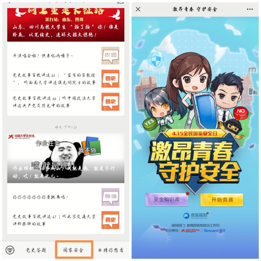 此次活动大力宣传总体国家安全观,普及《国家安全法》《反恐怖主义法》《反间谍法》等法律法规。学生通过关注“中国大学生在线”公众号参与国家安全教育知识竞赛活动。答题共设20道,题型分为判断题和单选题,题目内容涉及总体国家安全观及政治安全、军事安全、国土安全、经济安全、文化安全等多方面。活动结束后,参与线上竞答的学生可获得中国大学生在线颁发的学习证书,获取证书后,可通过上传证书至易班课群获取PU学时。