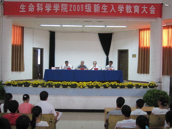 9月7日上午,生科院2009级新生入学教育大会在校大礼堂隆重举行。生科院院长金光明、党总支书记郝振中、副院长鲍方印、党总支副书记周向群以及全体辅导员、新生班主任、2009级新生参加了会议。会议由郝振中主持。