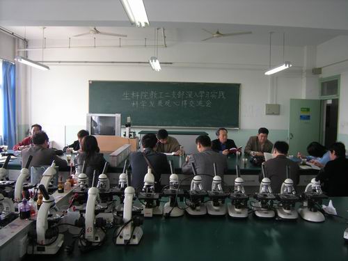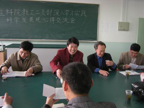 4月22日下午,生科院教工二支部全体党员在动物实验室开展深入学习实践科学发展观心得交流会,党总支副书记郝振中和群众代表夏海武教授也应邀出席了会议,会议由支部书记孙玉军同志主持。