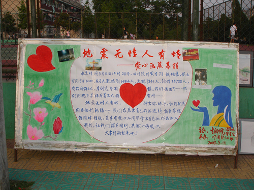 5月16日上午,生命科学学院07园林(2)班开展了一次“地震无情人有情”画展义卖募捐活动。作为园林专业的学生,同学们将自己平时的绘画作品拿出来进行展示义卖,同时也倡议学校的同学捐出自己的作品并加入此次义卖,用自己的实际行动为受灾的同胞们尽自己的一份力量。