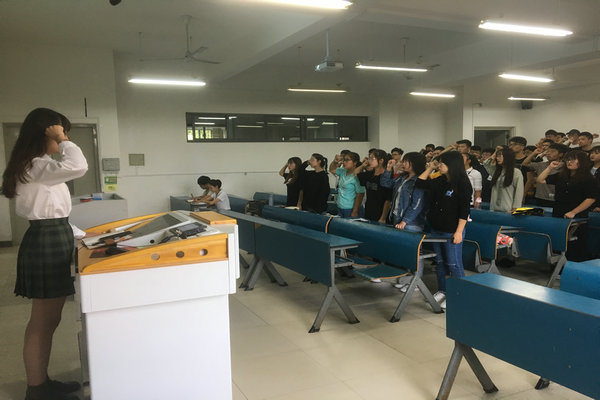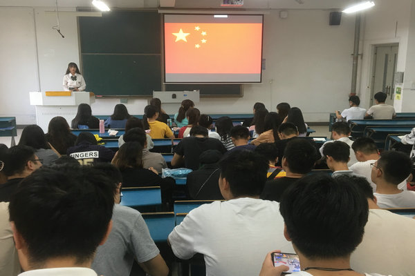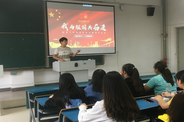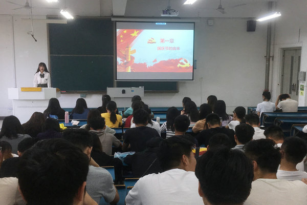 陈皖豫向同学们介绍本次主题团日活动的背景和意义,希望通过“沉浸式”的仪式教育,激励和引导班级同学大力弘扬以爱国主义为核心的伟大民族精神,进一步坚定“四个自信”。她以PPT汇报的形式向大家介绍了国庆节的由来、新中国成立70周年取得的伟大成就以及如何做好一名合格的共青团员。