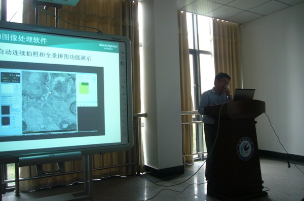 2014年5月8日下午3:00,安徽科技学院实验室与实践基地管理处分析测试中心邀请天美公司应用工程师周海鑫博士在躬行楼8号楼举办了电子显微镜简介及HT7700简介讲座。来自化学与材料工程学院、食品药品学院、动物科学学院、数理与信息工程学院、生命科学学院、城建与环境学院、机械学院等学院的21位教师参加了本次讲座。