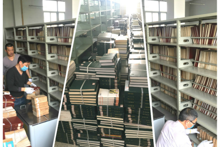 打捆工作在陈明副馆长的带领下,开展的井井有条:有按序下架的、有标记次序号的、有打捆的、有按序码放的,大家干得热火朝天,汗流浃背。过期期刊经装订后又厚又重,一捆有二三十斤重,搬运起来特别困难,馆员们不惜体力,争先恐后,有的甚至磨破了手套,碰伤了手指。部分过刊陈旧经年,粉尘引发了鼻炎、皮肤过敏,馆员们就在暑热难当的天气中戴着口罩,身着长衫工作服,继续工作,毫无怨言。一个个忙碌的身影、一滴滴晶莹的汗珠凝结成一道道亮丽的风景线。