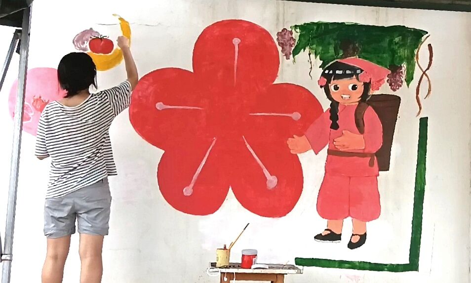为更好地宣传梅楼村,志愿者在设计墙绘时深入走访当地村干部和村民,听取历史故事,翻看宣传册等,深入了解乡村的历史渊源和人文风情,并将这些元素有机融入到作品中。壁画内容丰富多样,有新颖的梅桥镇人物形象“梅姑娘”,也有梅桥和杨楼村的特色蔬菜水果。同学们顶着炎炎烈日,挥洒汗水和热情,构图、调色、上色、刻画,有条不紊,认真勾勒每一个细节,每一幅壁画都是一幅文化的传承,一幅富有情感的作品。在绘画过程中,志愿者不仅注重绘画技巧的运用,也着力将艺术融入乡村生活。