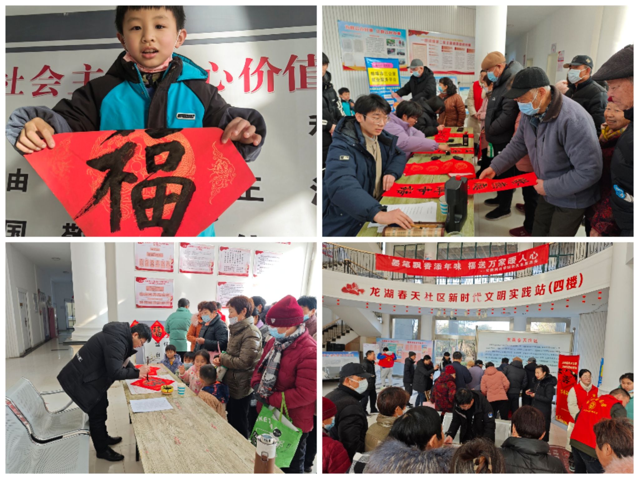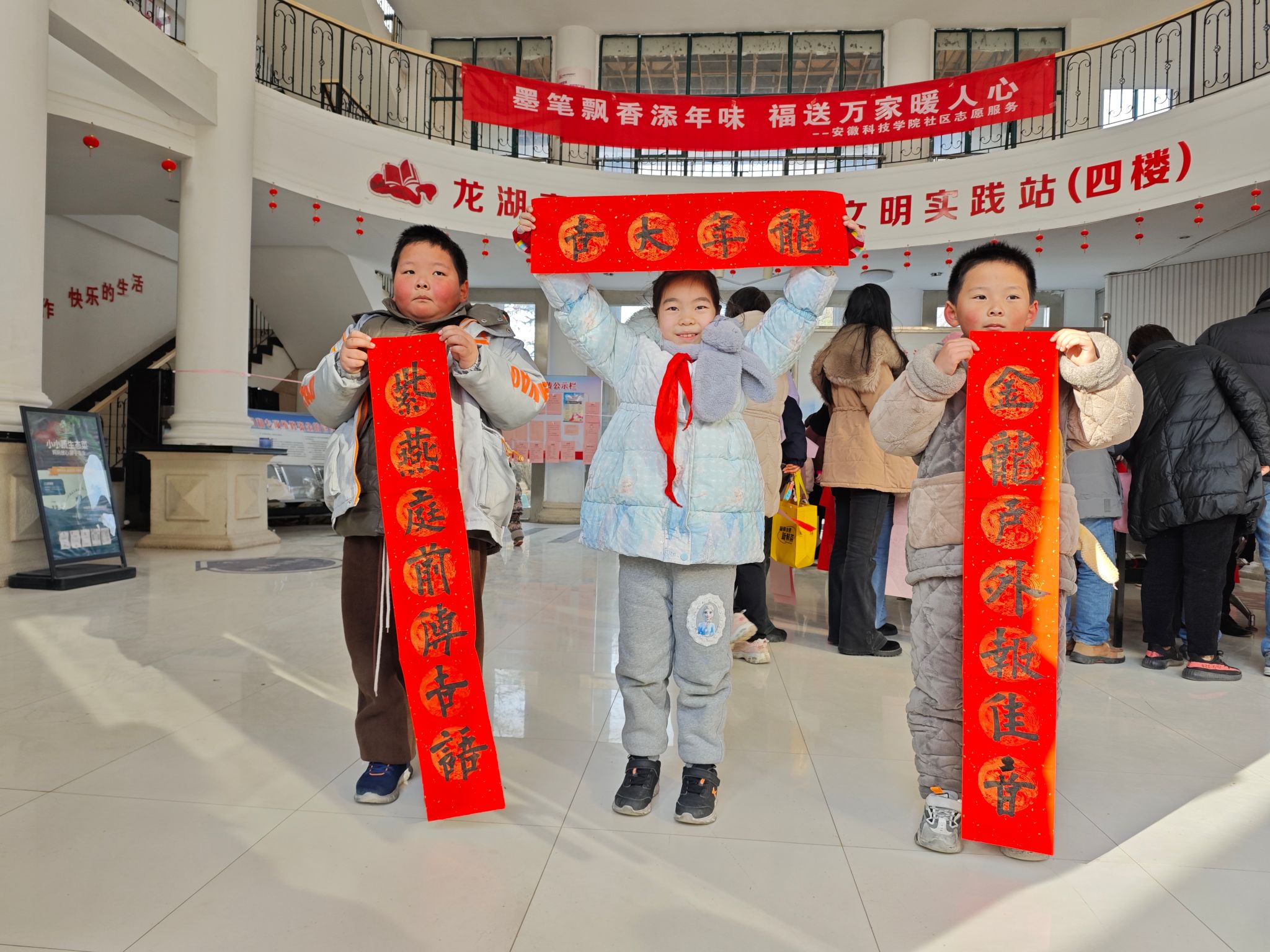 1月15日下午,我校志愿者走进蚌埠市龙子湖区东升街道龙湖春天社区,开展“墨笔飘香添年味 福送万家暖人心”义写春联送祝福活动,将新年祝福倾注于一笔一划中,为社区居民送上充满年味的文化礼物。