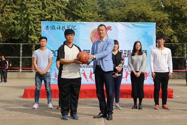 黄立义代表组委会接过联赛循环冠军奖杯,并向大学生裁判团团长授球。在青年学子的热切期待中,黄义立宣布安徽科技学院第九届大学生篮球联赛正式开幕。