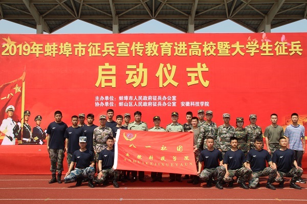 为积极贯彻党的十九大精神,落实国家征兵政策,鼓励和引导在校大学生应征入伍,进一步做好2019年的征兵任务,5月10日上午,蚌埠市2019年大学生征兵启动仪式在我校龙湖校区风雨操场举行,我校八一社全体成员为活动提供志愿服务,助力征兵工作。
