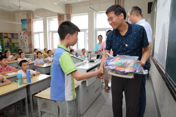 在听取实践团成员黄玉瑾对十天以来已开展的实践工作和活动的介绍后,校地双方领导走进教室,现场听取和感受实践团的精彩课程。卫胜、黄立义向参加课程的留守儿童们分发了学习用品彩虹包。