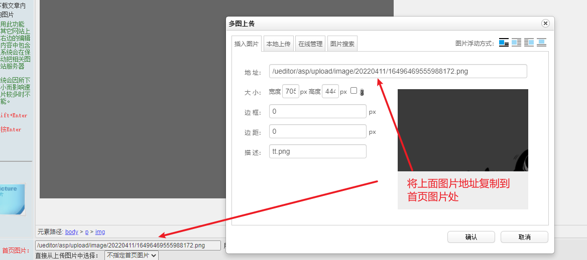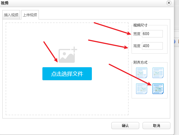 在发布文章时可加入视频,点击视频上传小图标,弹出视频上传窗口,点击“浏览”选择本地电脑中的视频,注意上传文件的文件名只能是英文加数字的组合,视频播放窗口大小一般设置为宽600,高400.