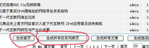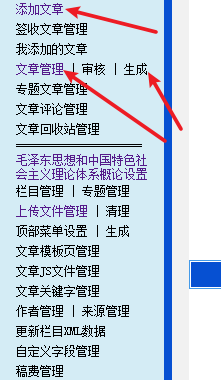 使用管理员帐号密码登录网站管理系统以后,屏幕左边是功能菜单,屏幕右边是每项菜单的具体操作内容。在日常使用中主要用到“添加文章”、“文章管理”、“生成”三个功能,其他菜单基本使用不到,在不知道操作结果的情况下,最好不要使用。
