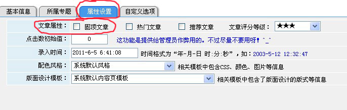 在发布文章时,点击“属性设置”,然后在“文章属性”里将“固顶文章”选中即可。