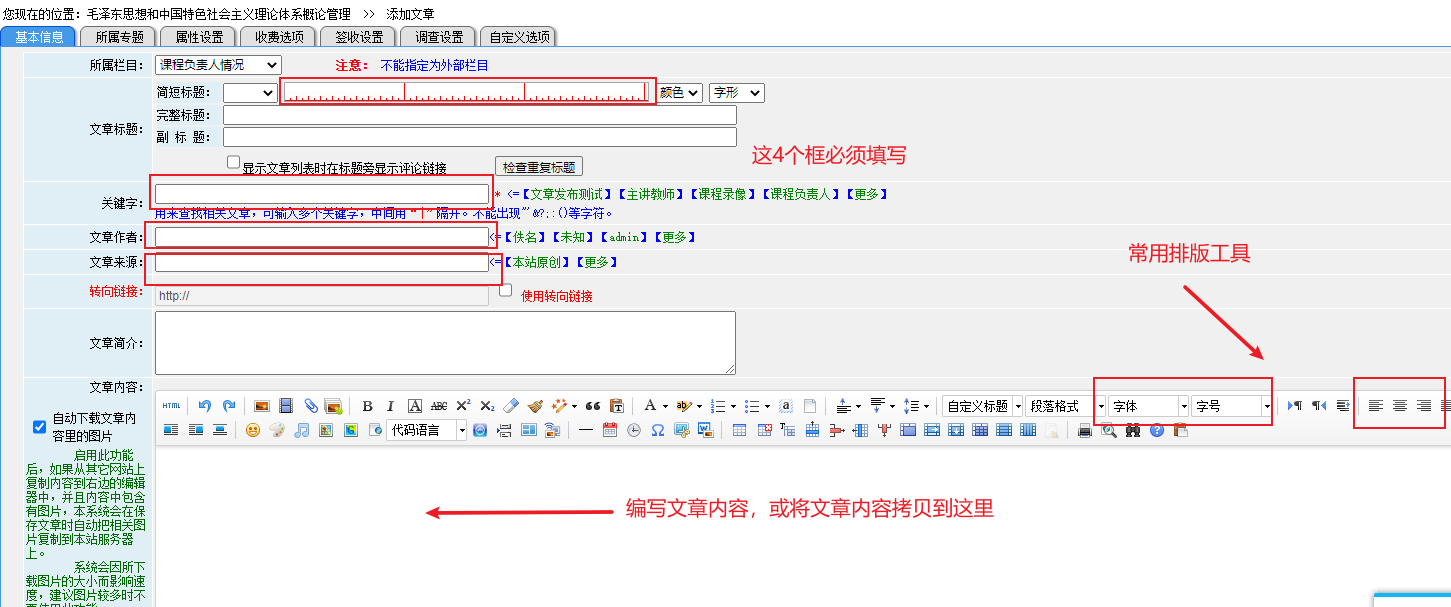 首先点击左侧菜单中的添加文章,然后在右侧具体操作内容中:选择文章的“所属栏目”,在“简短标题”后的长文本框里填写文章标题,然后填写文章的“关键字”、“文章作者”、“文章来源”三项信息,最后在文章内容文本框中填写具体内容即可,其余项不用填写,最后点下面的添加。