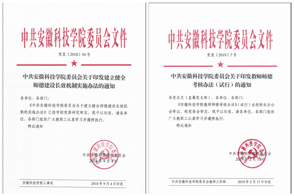 师德建设长效机制逐步健全。学校先后印发《中共安徽科技学院委员会关于建立健全师德建设长效机制的实施办法》和《安徽科技学院教师师德考核办法(试行)》等规章制度,编制《师德教育手册》,专门设立了“安徽科技学院师德师风专题网站”,宣传国家、省和学校有关师德师风相关文件及规章制度,通过“教师访谈录”和“师德风采”弘扬优秀师德典型,鼓励广大教师以德立身、以德立学、以德施教、以德育德,推动学校师德建设工作常态化长效化。2019年我校教师詹秋文获评“安徽省新时代育人楷模”,胡月英、姚大怀获评“安徽省优秀教师”,李升和获评“安徽省教育系统先进工作者”;学校评选出校级“师德标兵”10人。