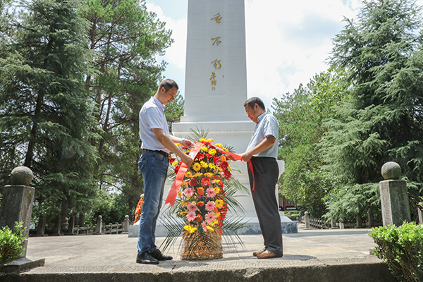 大别山陵园烈士纪念碑始建于1958年,碑高13.5米,意在纪念大别山区十三万五千英烈,碑面镌刻朱德总司令亲笔题写的“革命烈士永垂不朽”八个大字。在机关一党总支书记李永生带领下,党员们在纪念碑前集体重温入党誓词,深情缅怀革命先烈的丰功伟绩,表达深切怀念和崇高敬意。铿锵的誓词,坚定的承诺,让每一位党员同志的心灵再次受到震撼和洗礼。宣传网络党支部书记胡振江、工会团委党支部书记黄立义怀着无比崇敬的心情向革命烈士纪念碑敬献花篮。