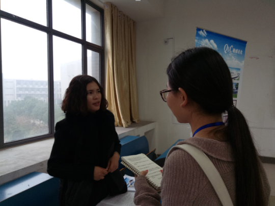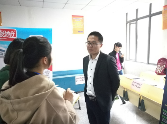 在采访过程中,昂翔向笔者介绍他自己,是我校13级工商管理专业的学生,回到学校来招生很开心,现已实习四个月,公司升职力特别大,短时间内他就已经做到部门经理。他告诉我们公司会对初入成员进行培训,在培训中会发现自己的很多不足,但能力也会在培训中慢慢提高。他们每月都有特定的会议,公司氛围特别好,很适合毕业生发展。他表示刚毕业的大学生很有热情,而他们是开放性的招生,专业不对口的很多,他们更看重的是态度与能力。随后他向他们的负责人介绍了我们。