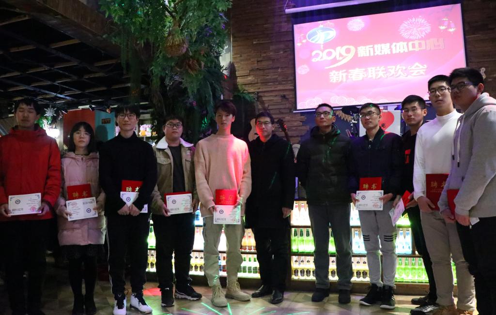 会上,还进行了迎新年晚会表演。新媒体中心凤阳龙湖两校区全体成员欢聚一堂,通过唱歌、跳舞、吉他弹唱、电子琴独奏、笛子演奏等多种形式迎接2019年的到来。
