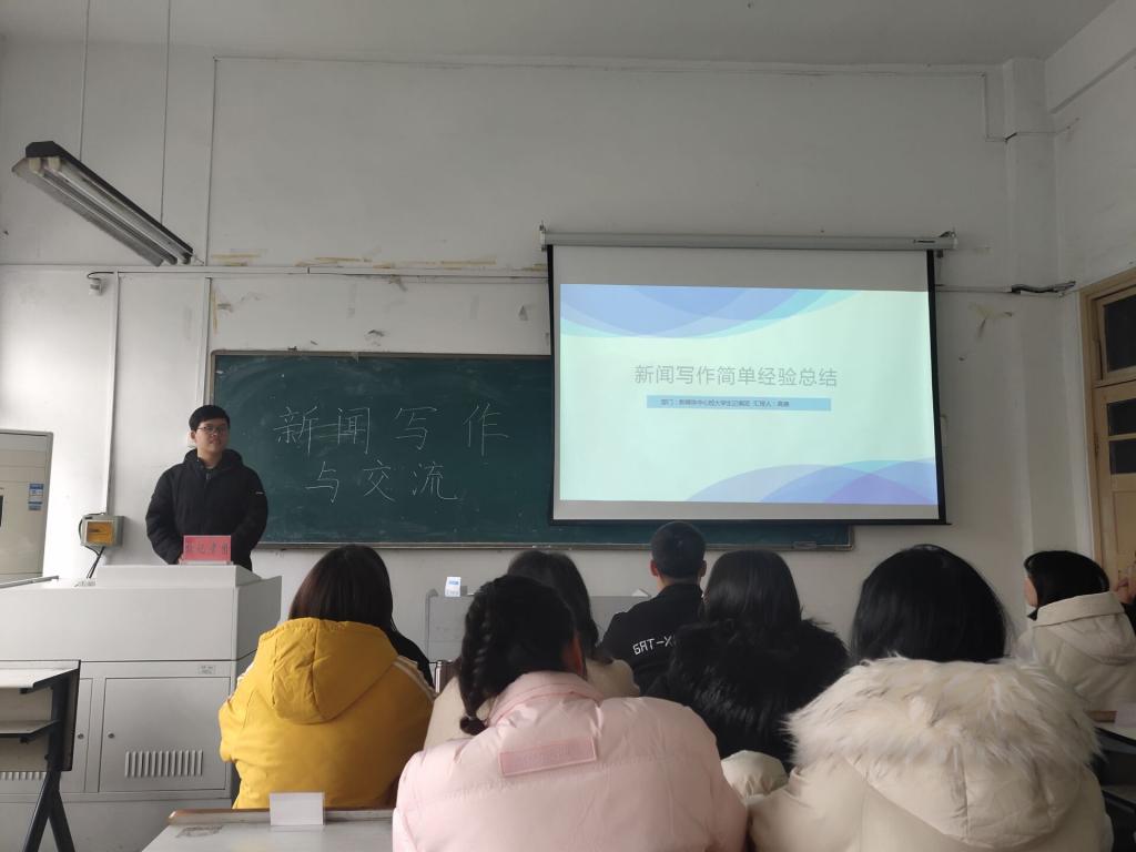 记者团副团长高悬通过PPT展示分享了拍照与新闻稿写作的相关经验,强调两者之间相辅相成的密切关系,并着重讲解了新闻稿语言、结构的写作方法和注意事项。他认为,新闻稿写作要在形式上符合规范,在内容上创新出彩。同时,他还就同学们常犯的写作问题提出了相应的改正意见。