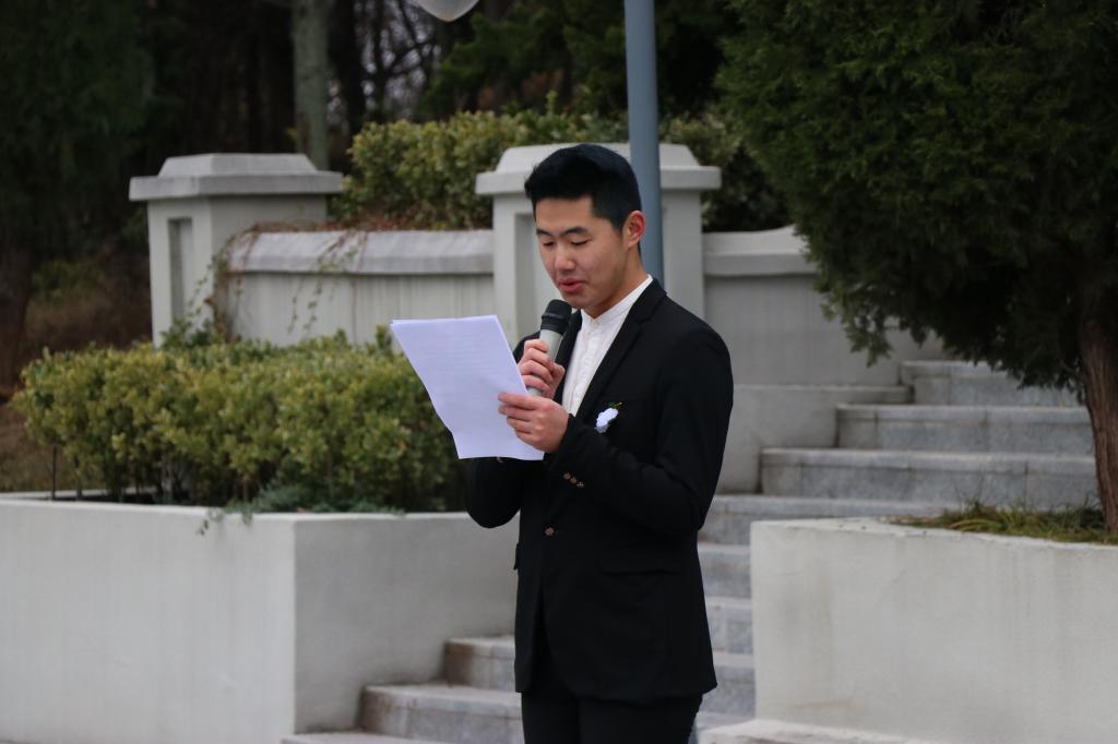 随后,来自爱心社、校卫队和武术协会的学生代表发表爱国主题演讲。伴随着《献花曲》,四名礼兵向烈士纪念碑敬献花圈,各组织同学紧随其后敬献白花。全体人员在纪念碑前行三鞠躬礼,向烈士表达崇高的敬意和深深的哀念。