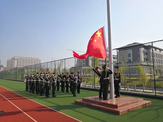 国旗班出旗、升旗是每周一早晨的常规仪式,在简短的2分24秒里,我们看见了国旗班成员整齐划一的步伐,气宇轩昂的风采;我们感受到了升国旗仪式的庄重严肃,神圣威仪。但我们不知道的是,国旗班队员为了守护国旗的尊严而进行的日复一日年复一年的“军事化”训练。“每周2至3次训练作为日常训练,每学期第16周结束训练并进行动作考核。一般开学的前一天我们也会组织训练,因为第二天要升旗,升旗前一天除基础训练外还需要模拟升旗。三个旗手每周还会抽出时间进行旗手训练,练习默契度。”除此之外,口令员的口号是否下达准确;擎旗手展旗的角度是否达到了精准的45度;升旗手升旗时摇柄转动的圈数是否为93圈,指挥剑端剑是否正等等,全都是国旗班训练的内容。在我们看来,或许每周抽出这么多的时间来练习同样的动作过于枯燥无趣,但国旗班队员却对此毫无怨言,在他们看来,每一次训练都是为了更好地提高自身素质,从而更完美地完成升旗。