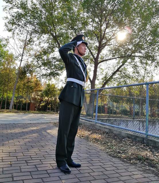“2015年11月30日,周一,是我第一次升旗的日子。那天早晨我不到五点就起床了,其实睡得也不安稳,很激动又怕迟到。洗漱完之后花了半小时穿军装,步骤较多,担心穿戴不整齐会影响国旗班形象。结果到了之后发现大家都很激动,很多队员比我来得还要早。第一次升国旗的过程中,血液沸腾燃烧的感觉我可能一辈子都忘不了。”谈及第一次升旗的感受,翟针峰依旧热血澎湃。