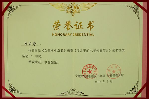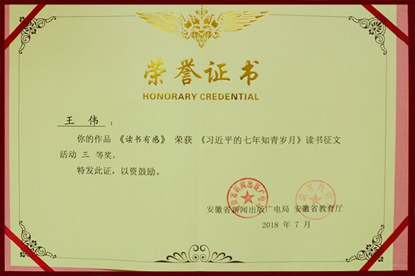其中财经学院储梦圆的《少年强则国强》荣获二等奖,生命与健康科学学院方文秀的《在苦难中成长》荣获三等奖,财经学院王伟的《读书有感》荣获三等奖,《安徽科技学院报》编辑部获评“优秀组织单位”。