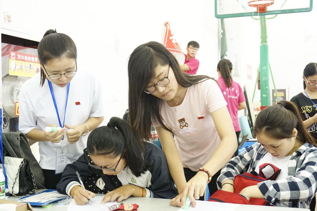 学生党员们也正在耐心地为“萌新”答疑解惑,积极为新生及家长服务,满怀热情,党徽在胸前闪耀。