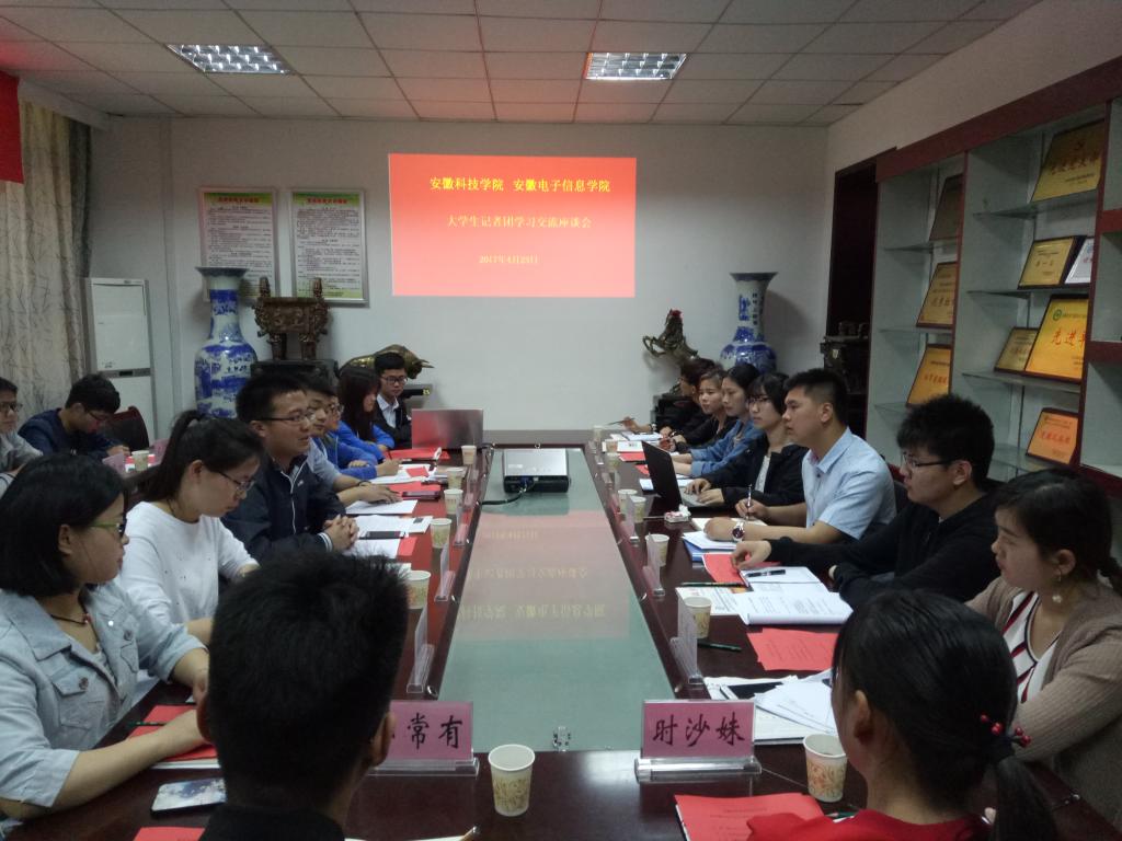 为增进蚌埠地区高校记者团友谊,加强交流,4月23日上午,安徽电子信息职业技术学院大学生记者团一行八人来我校交流校园媒体工作。