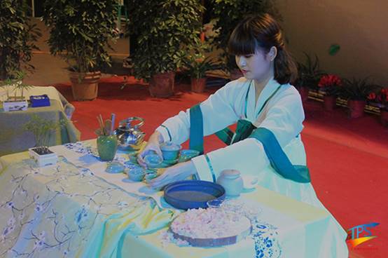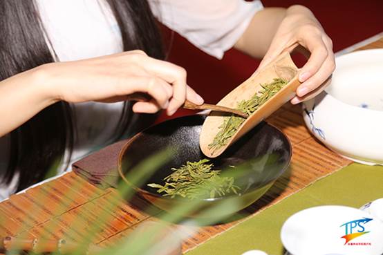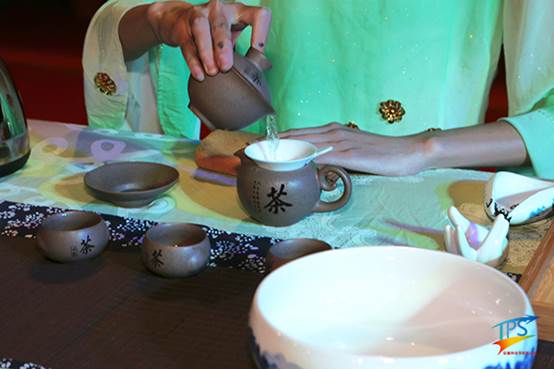 一诗,一词,一茶,一盏,铅华尽洗。茶是草中仙,日月光华入芽尖,蒙蒙漠漠香色绝,还需妙手巧烹煎。今天,表演者手托茶杯旋转闻香,举手投足皆顺应音乐的起承转合,给人以美的享受。