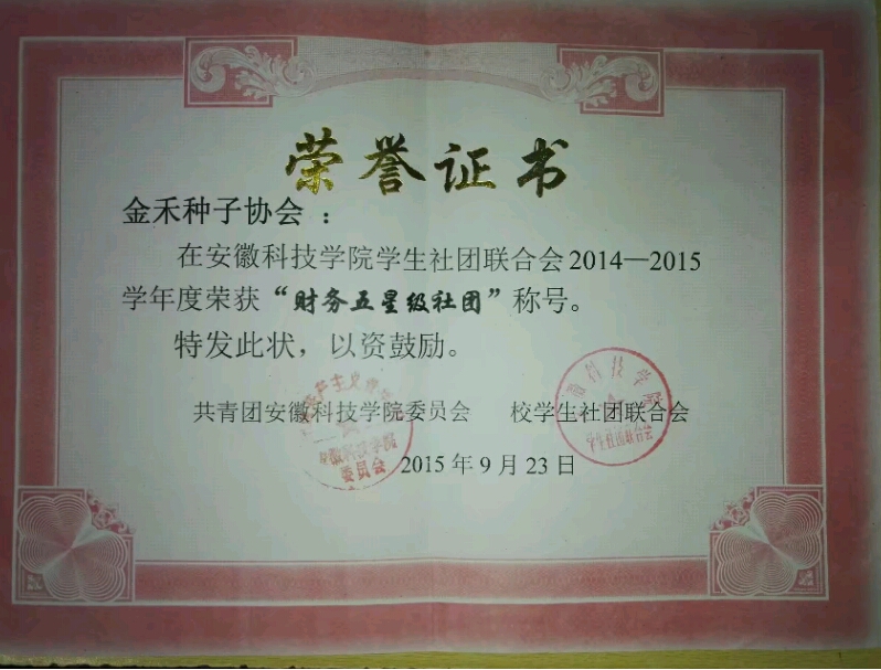 金禾在这三年中获得过一次财务知识大赛一等奖,和最佳开拓性社团