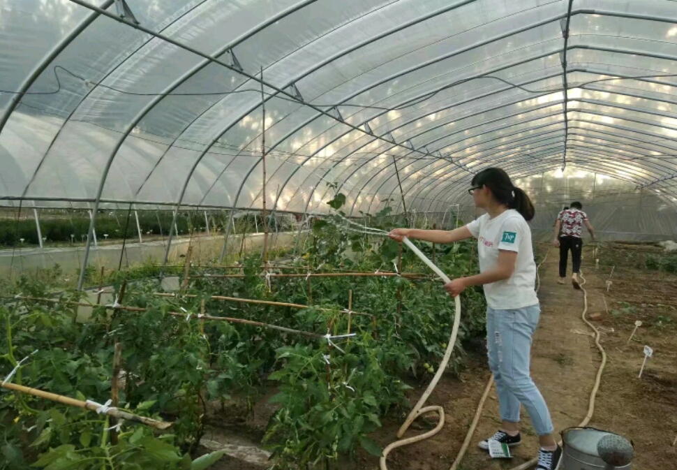 社团成员在为正在成长的西红柿和黄瓜浇水