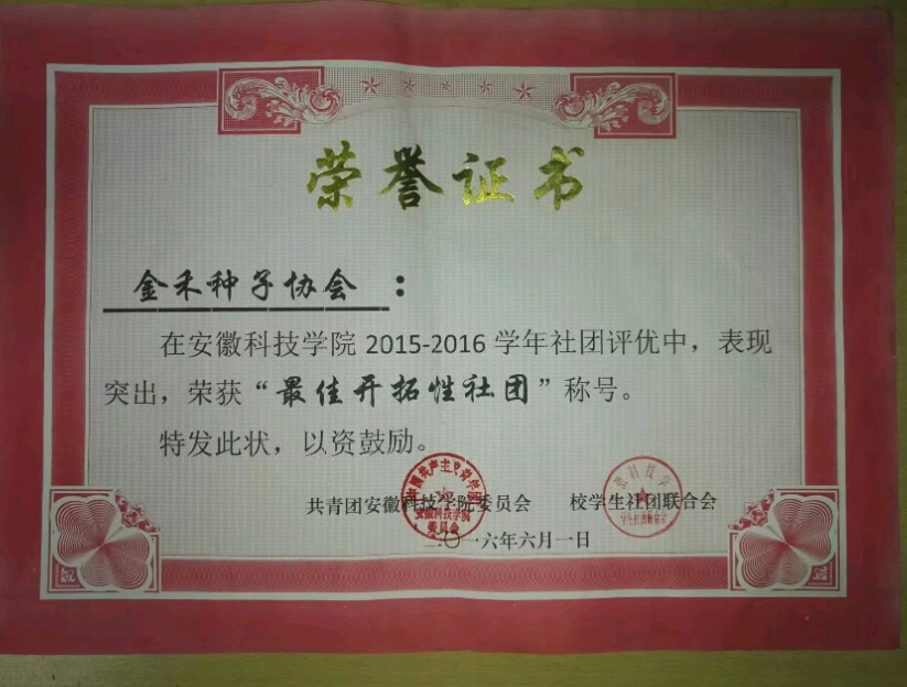 校金禾种子协会现任会长姜侃,来自农学院种子科学与工程162班,具有良好的组织能力、管理能力以及处理问题能力,积极参加学校各类活动。获得过优秀团员称号。